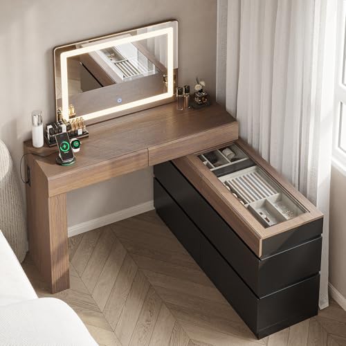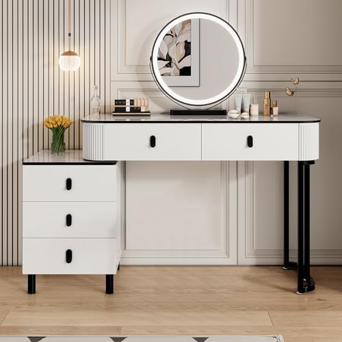 This modern vanity offers ample storage, making it ideal for makeup lovers with a large collection. Its outer drawers rotate 360 degrees, letting you create an “L” shape, an “I” shape, or tuck all drawers neatly under the desk, each locking securely in place. The vanity mirror features three light settings—warm, cool, and natural—while a sleek glass top and built-in outlets add both style and convenience.